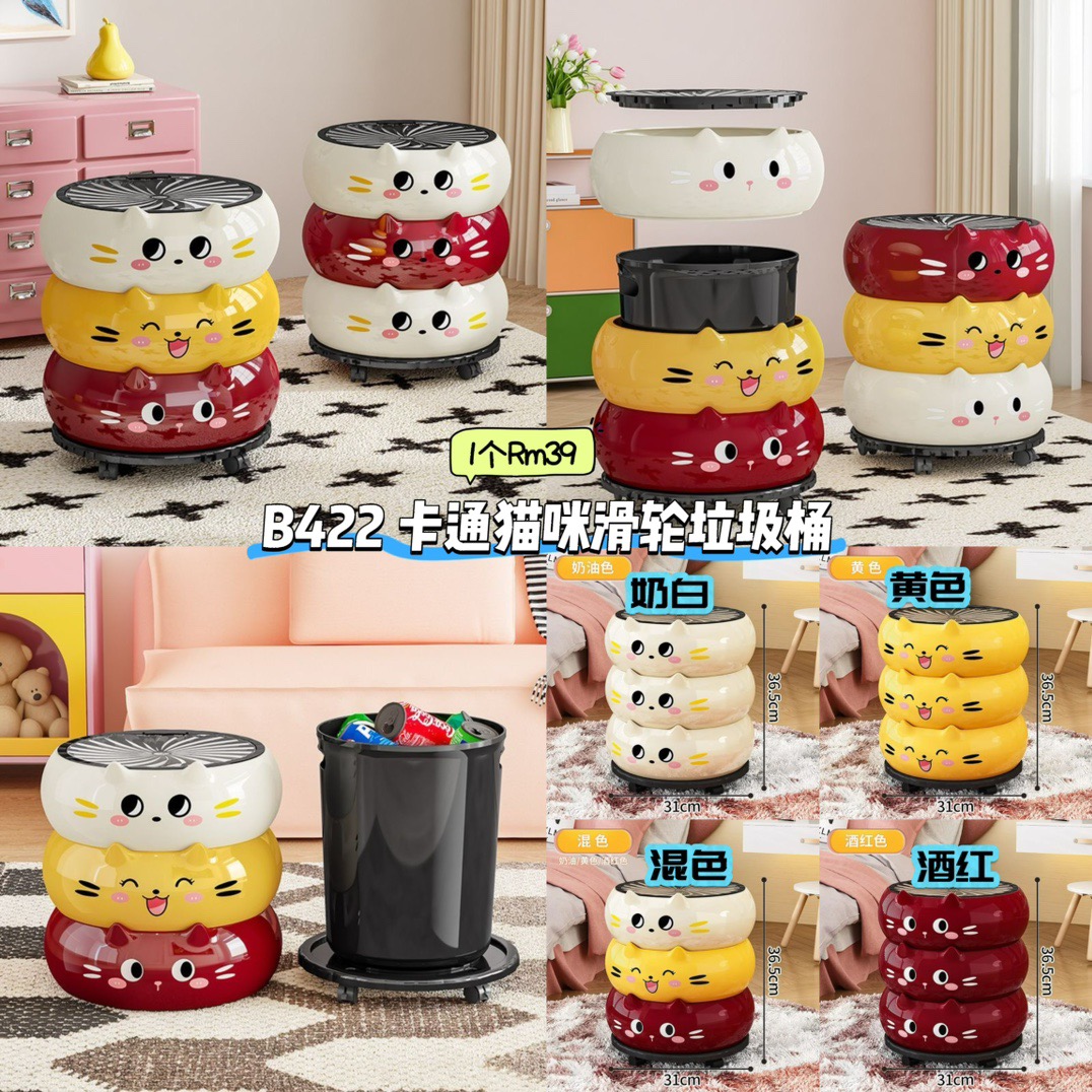 B422 卡通猫咪滑轮垃圾桶