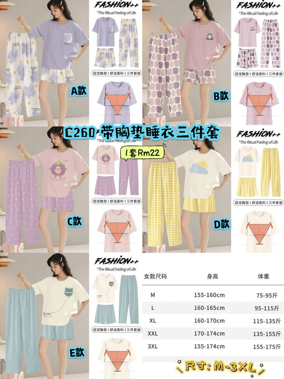 C260 带胸垫睡衣三件套