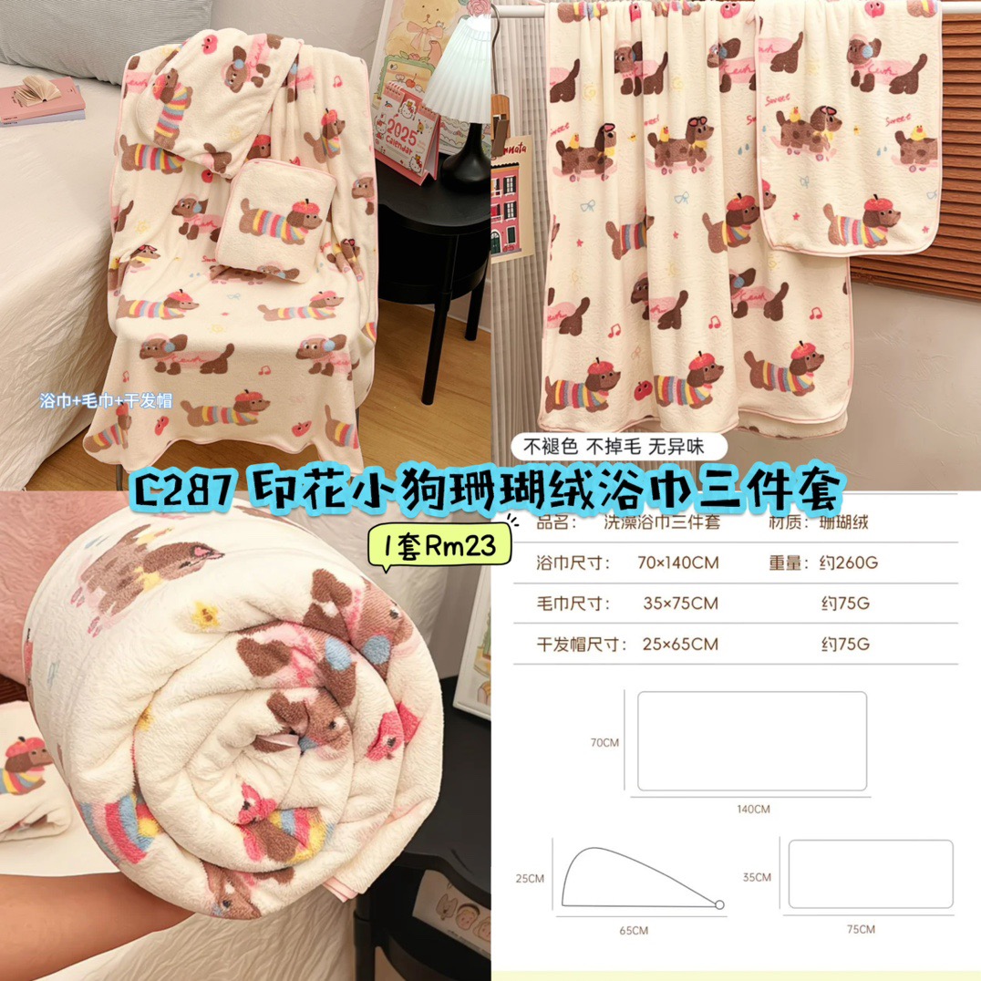 软fufu小狗珊瑚绒三件套!超强吸水不掉毛,可爱印花超治愈,洗护一套全搞定✨