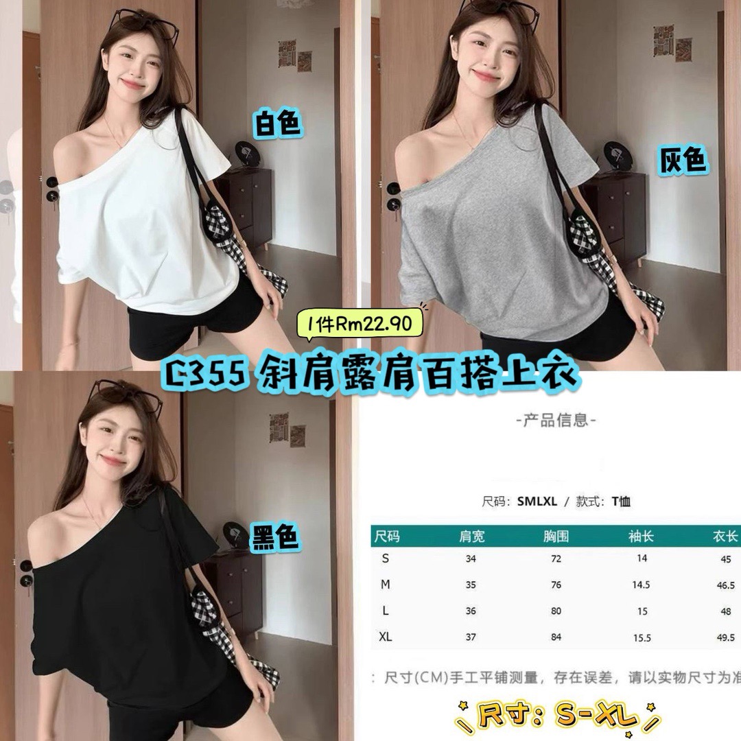 C355 斜肩露肩百搭上衣