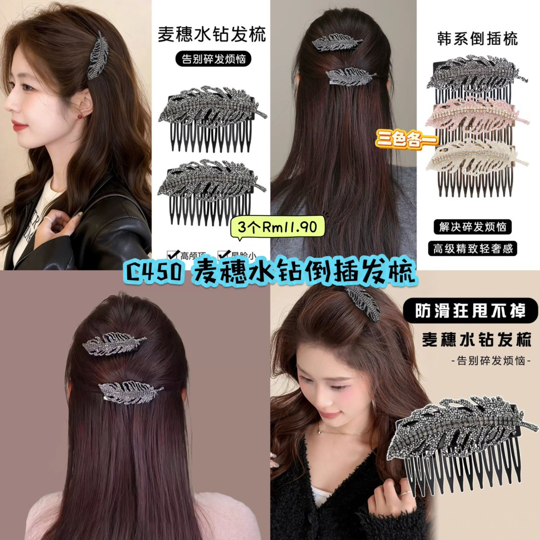 C450 麦穗水钻倒插发梳 (3色各1)