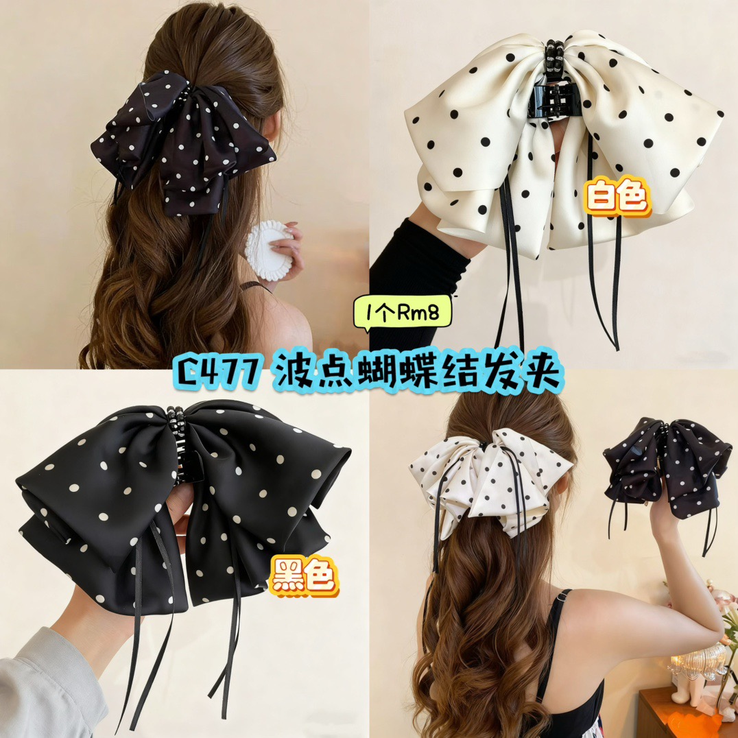 8氛围感发夹来啦✨超大蝴蝶结巨显发量,扁头救星~经典波点+流苏,复古又仙气!抓夹超稳不滑落,半扎发绝了!黑白两色闭眼入,搭配裙子超美!